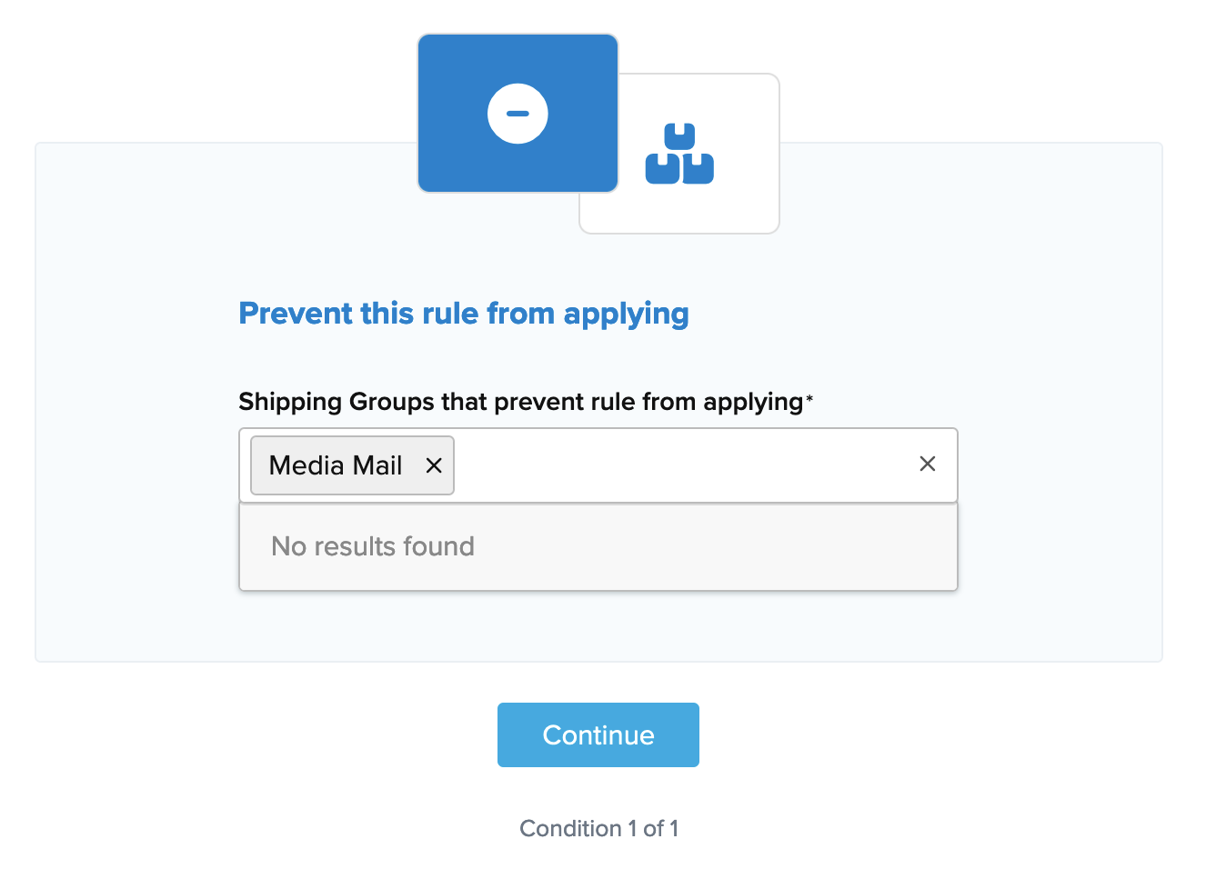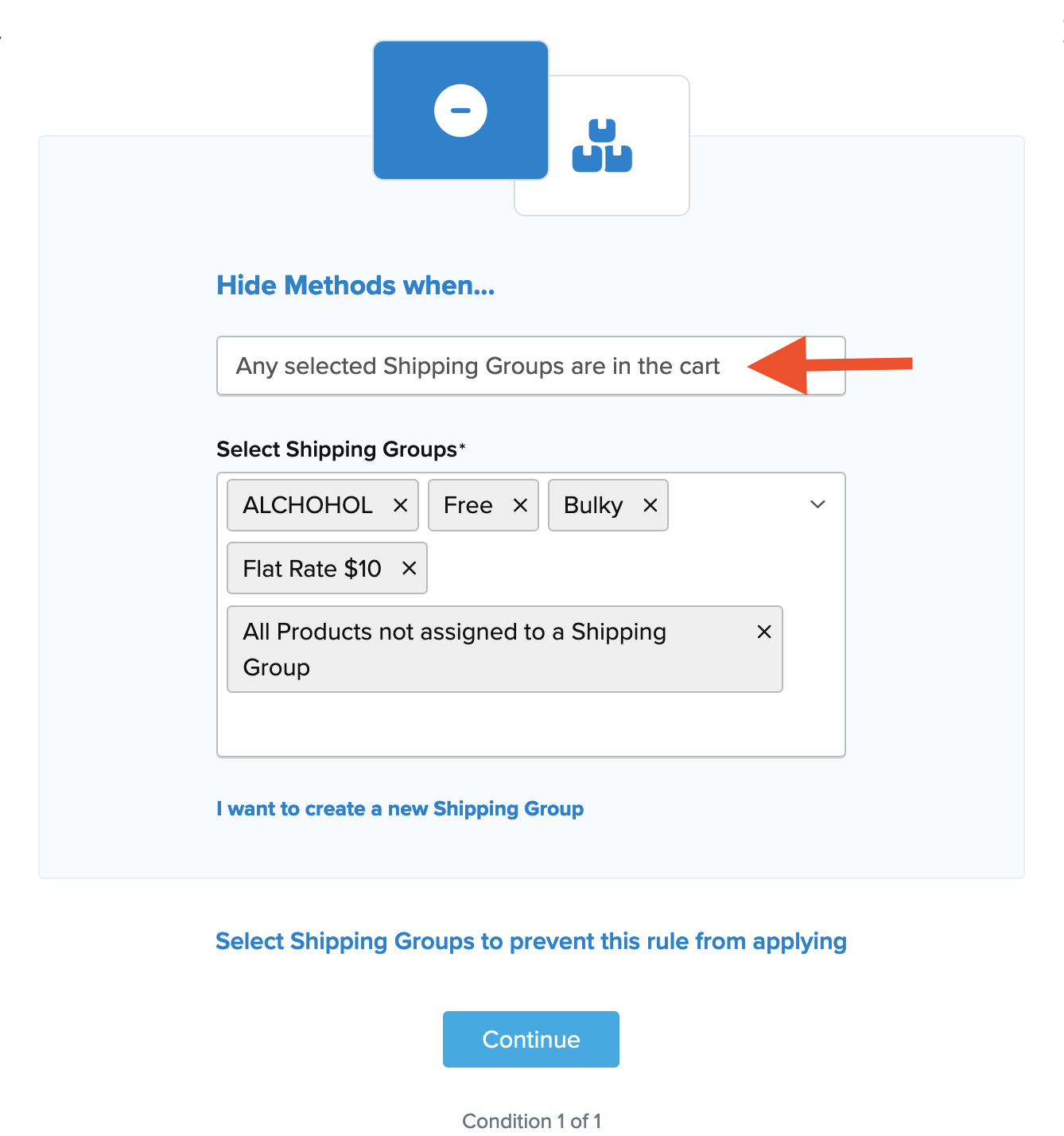 - Input the Conditions for the rule, select Shipping Groups, and click Continue.