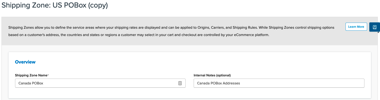 - In the Shipping Zone Name field, rename the Shipping Zone from US POBox (copy) to something relevant like Canada POBox.