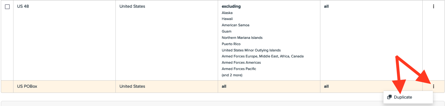 - Find the "US POBox" zone in the list and click the option to duplicate this zone using the option on the right side of the zone.