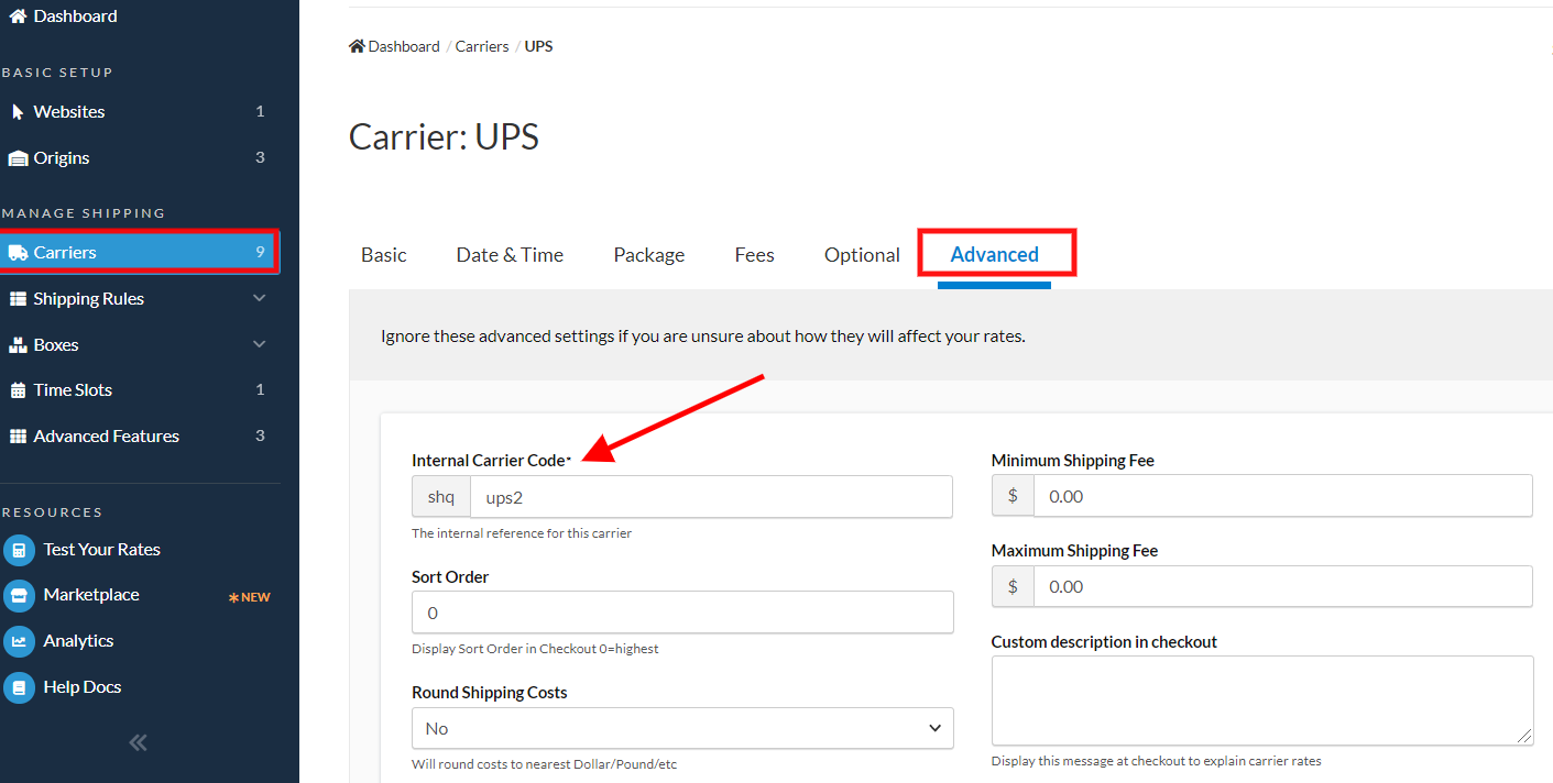 - Click the Advanced panel and find the 'Internal Carrier Code' field
