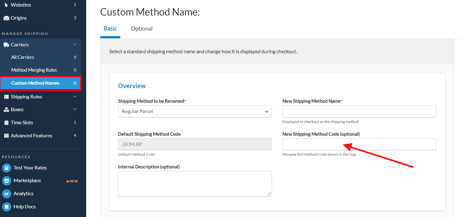 - Enter your desired method code in the ‘New Shipping Method Code’ field