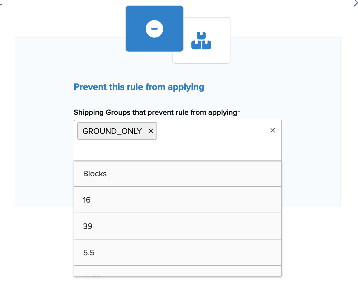 - You'll see a prompt to select a shipping group, but select the option "Select Shipping Groups to Prevent this Rule from Applying."