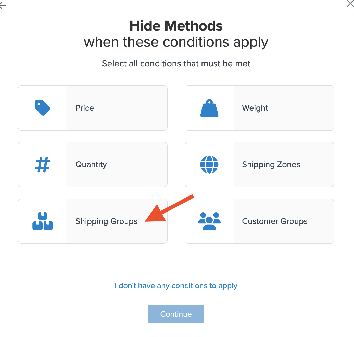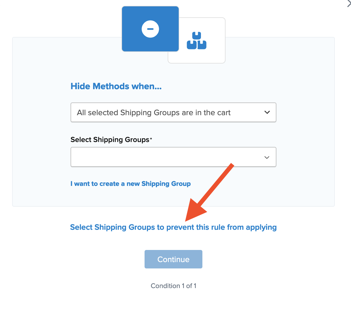 - Opt to use "Shipping Groups" for the rule condition, then click "Continue" to proceed.