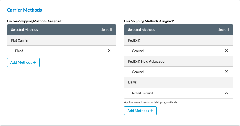 - (optional) Automatic method merging will combine the cheapest shipping method from each origin into a single rate. If you wish to customise this, go to Method Merging Rules under Carriers in the navigation. Set up merge rules for similar method types across your origins. If a carrier is available on all origins (like FedEx Ground for both your California and Texas warehouses), no merge rule is needed for that carrier.