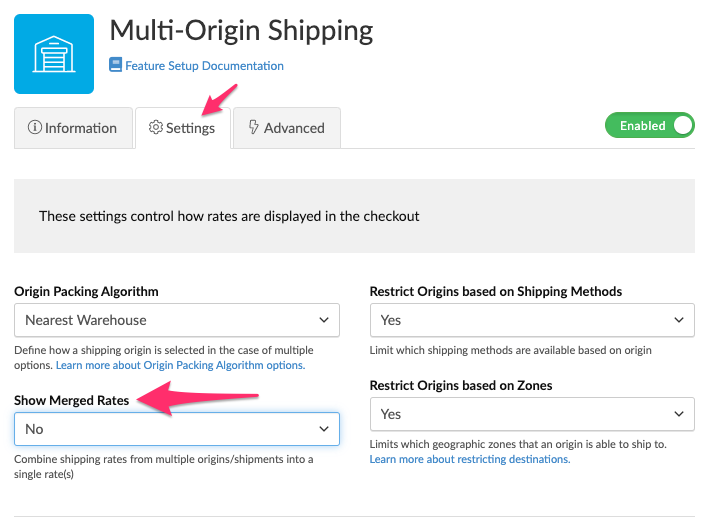 - Go to the settings page of the Multi-Origin Shipping feature. Change "Show Merged Rates" to No.