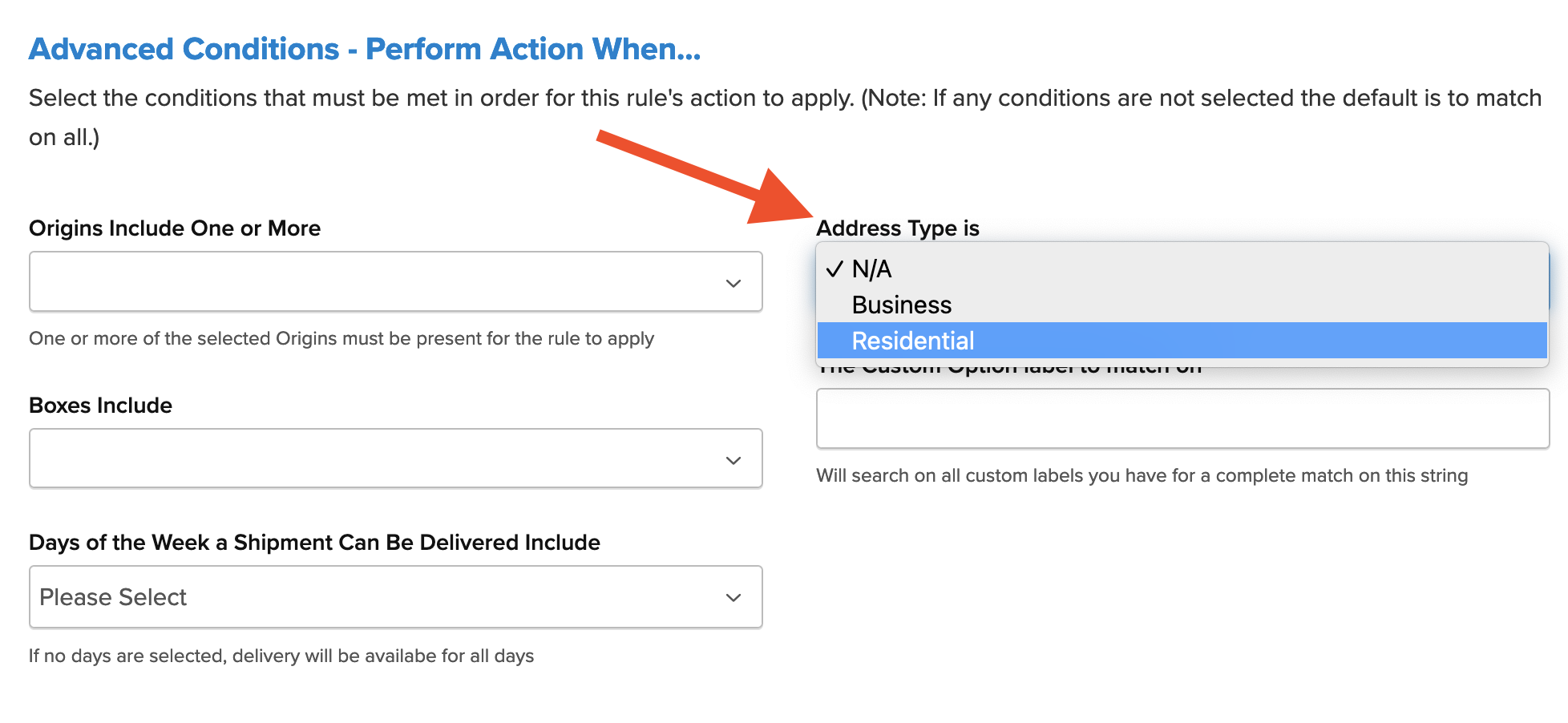 - Under the "Advanced" tab, locate the section titled "Advanced Conditions - Perform Action When..." Select "Residential" from the address type drop-down menu and save the rule.