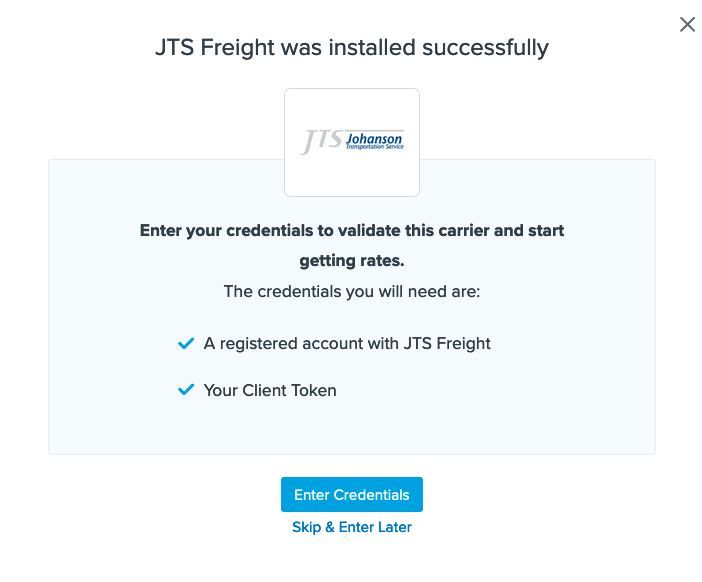 Once your client token is entered, ShipperHQ verifies it with JTS Freight Systems to ensure accuracy. You will receive a notification upon successful installation.