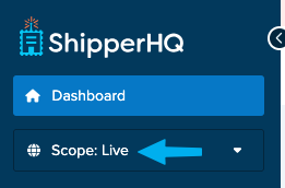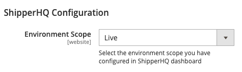 Stores > Configuration > Sales > Delivery Methods > ShipperHQ. - Ensure the Environment Scope dropdown matches your ShipperHQ environment scope setting with the Scope used for your API and Authentication codes.