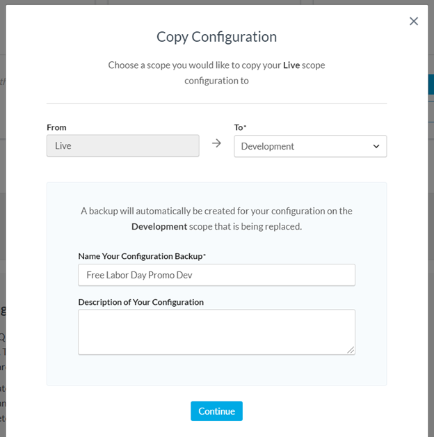 The "Copy To..." button lets you copy the configuration settings to another scope. If the destination scope already has settings, you'll be prompted to create a backup. This safeguards your ability to restore previous settings since a scope copy cannot be undone.