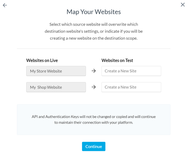 Each site in ShipperHQ has a unique API key and Authentication Code to connect configurations to your platform. These identifiers won't transfer automatically to prevent disrupting live or development setups. Instead, you'll map settings to existing sites or create new ones where none exist.