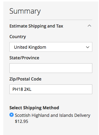 This example CSV includes common postcodes for the UK Highlands and Islands. Some postcodes use spaces, while others do not, to ensure accurate pattern matching. Shipping to PH18, a Highland location, will cost £12.95. Other UK postcodes, like SS7 5UH, are charged £25.