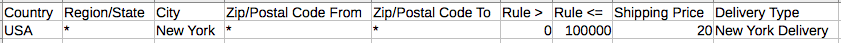 This example CSV allows for a $20 rate for shipping to New York. This type of delivery will only appear if the city field is displayed. By default, Magento does not show the city field in the cart estimator, but it is available at checkout. 💡