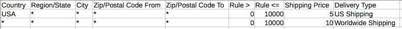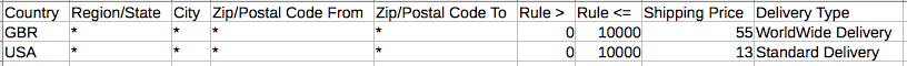 In this example CSV, a standard rate is defined for the USA, and a separate rate applies to all other countries, using destination shipping rule logic.