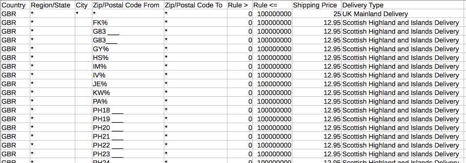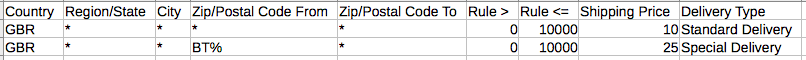 This example CSV provides a rate of £25 for Northern Ireland postcodes and £10 for the rest of the UK. Postcodes starting with "BT" use a wildcard (%) for matching.