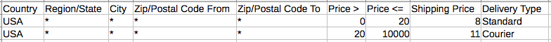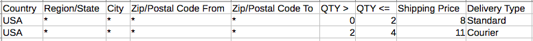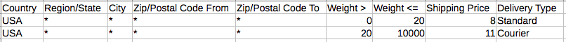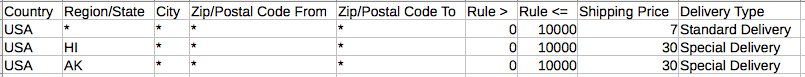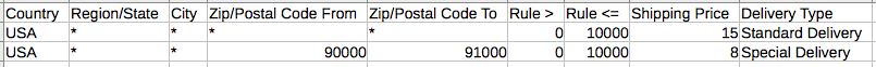 In this example CSV, a shipping rate of $8 applies if the postcode is between 90000 and 91000. All other US ZIP codes have a rate of $15.