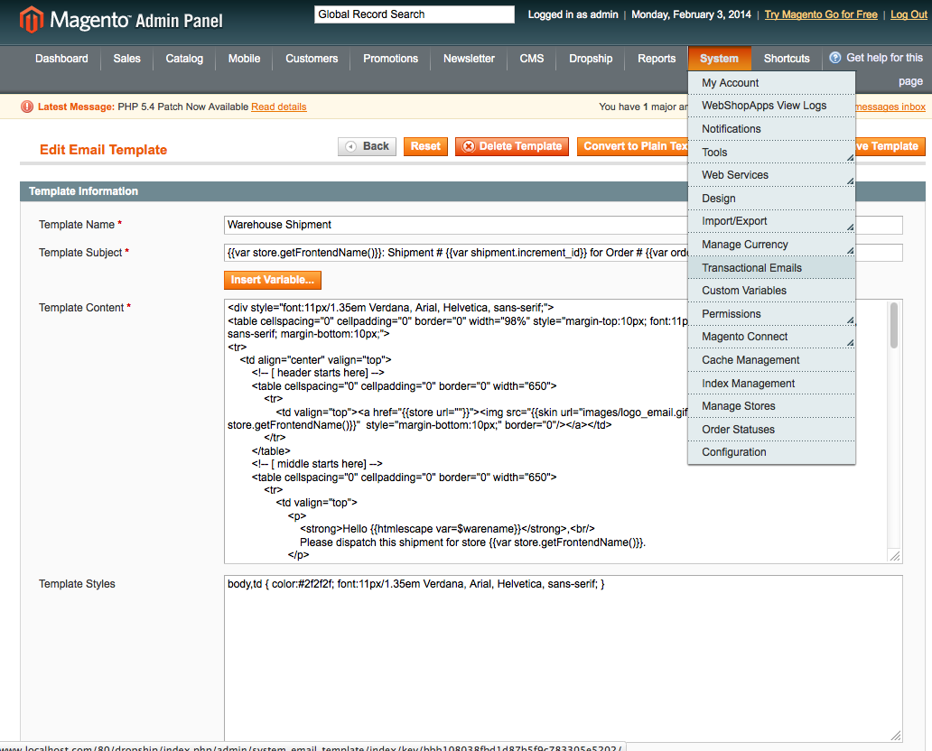 System->Transactional Email Templatesin your Magento admin panel. - Click