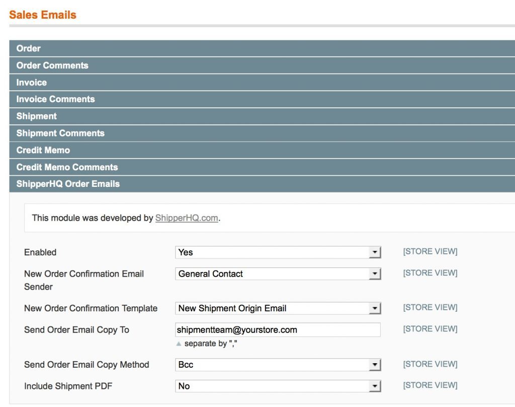 System->Configuration->Sales Emails->ShipperHQ Order Emails. - Enable this section.