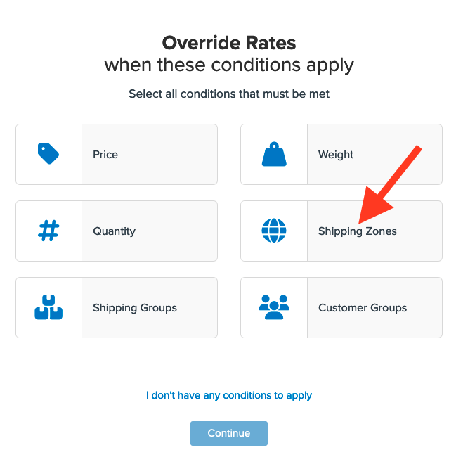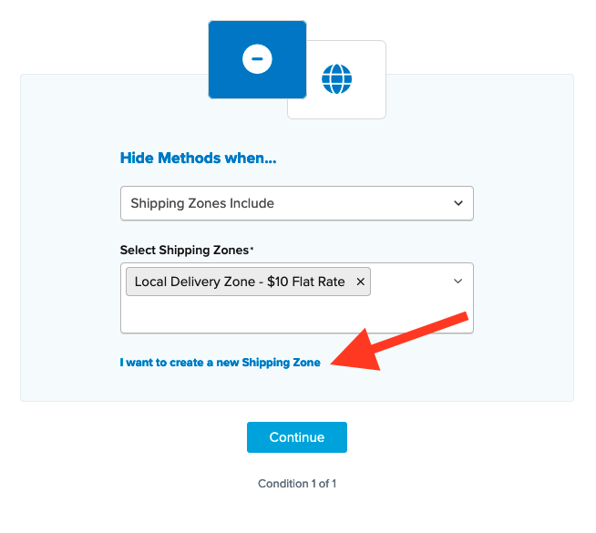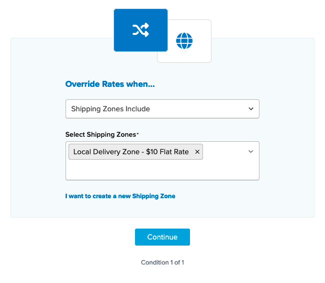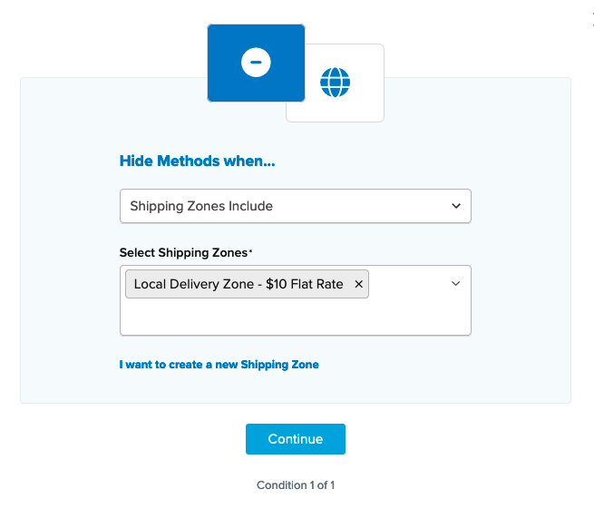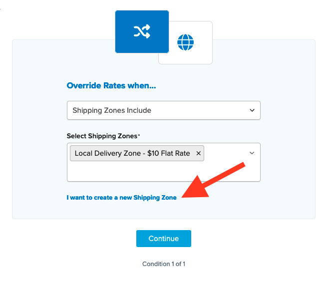- Use “Shipping Zones” for the rule condition & click “Continue”.
