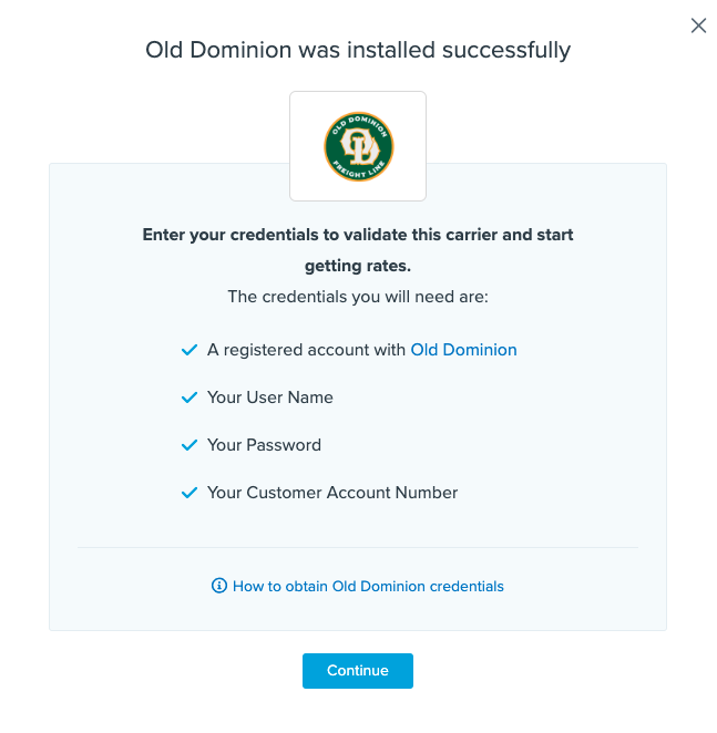 ⚠️ If validation fails, please Notify ShipperHQ Support for further assistance, or review your credentials and try again. - If validation is successful, click the toggle button to enable the Old Dominion carrier.