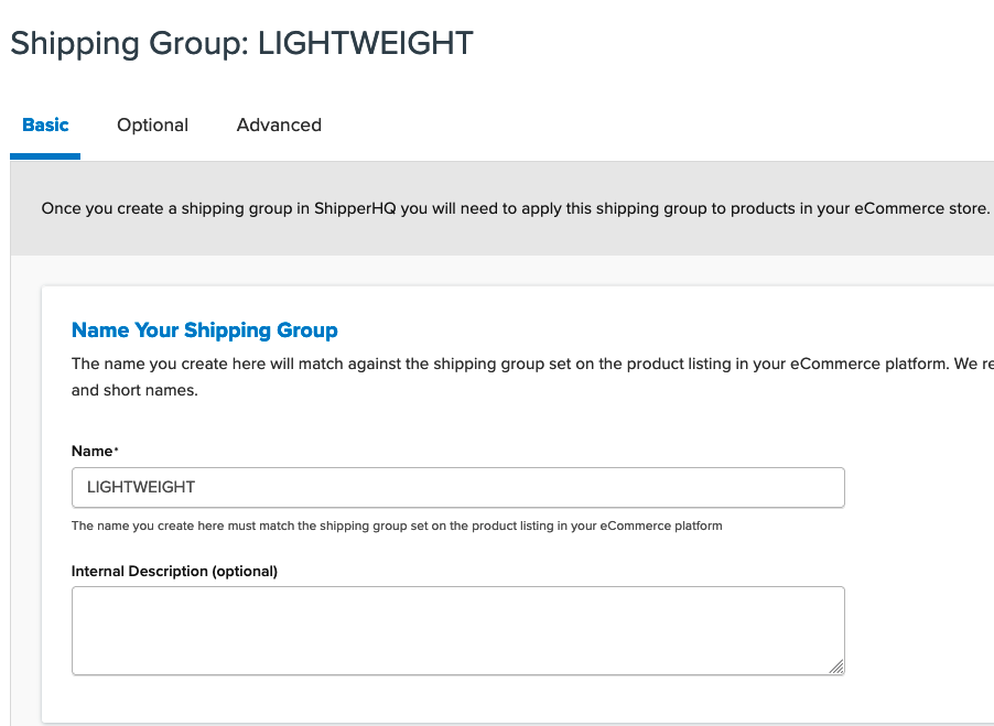 - Title the Shipping Group and click Save. For this example, call the group LIGHTWEIGHT.