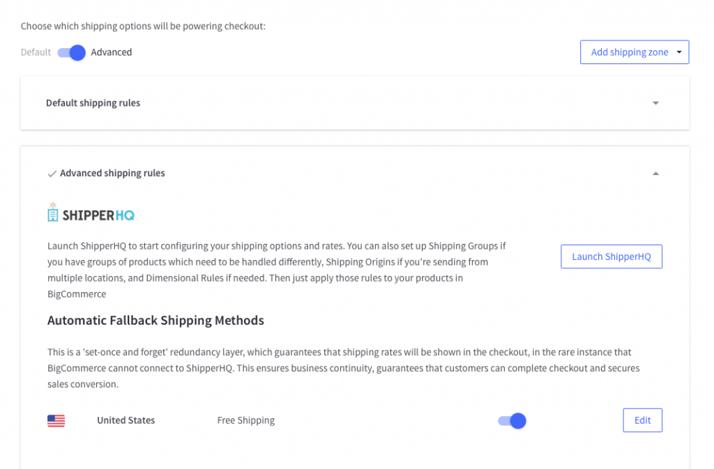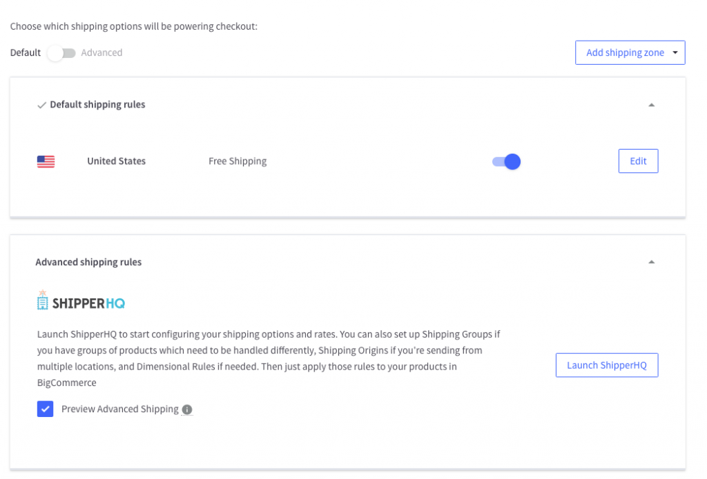 Switching to ShipperHQ won't erase your BigCommerce default shipping rules. You can alternate between "Default" and "Advanced" modes as needed. Flip back to "Advanced" when you're ready to use ShipperHQ again. 🔄
