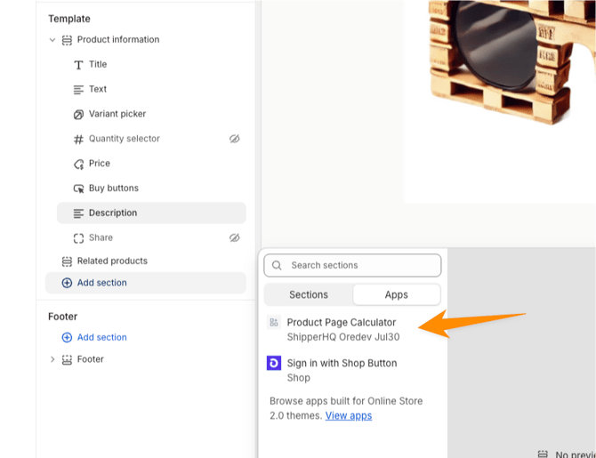 Select Apps tab, then select ShipperHQ Product Page Calculator App Block