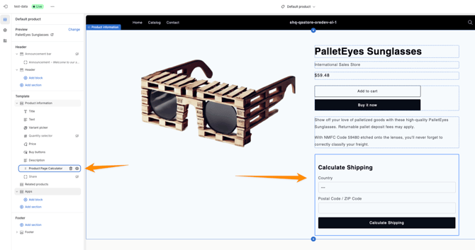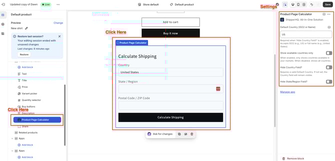 The Product Page Shipping Calculator App Block is now available on your product pages. Reposition where it sits on the page by moving the block within the layer panel.