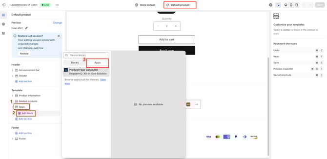In the "Default Product" page editor, click on "Apps" > "Add Block" > "Apps" > then select the Product Page Calculator
