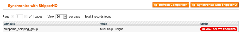 When synchronizing your Magento site with ShipperHQ, you may encounter the "MANUAL DELETE REQUIRED" status for some ShipperHQ-specific attributes.