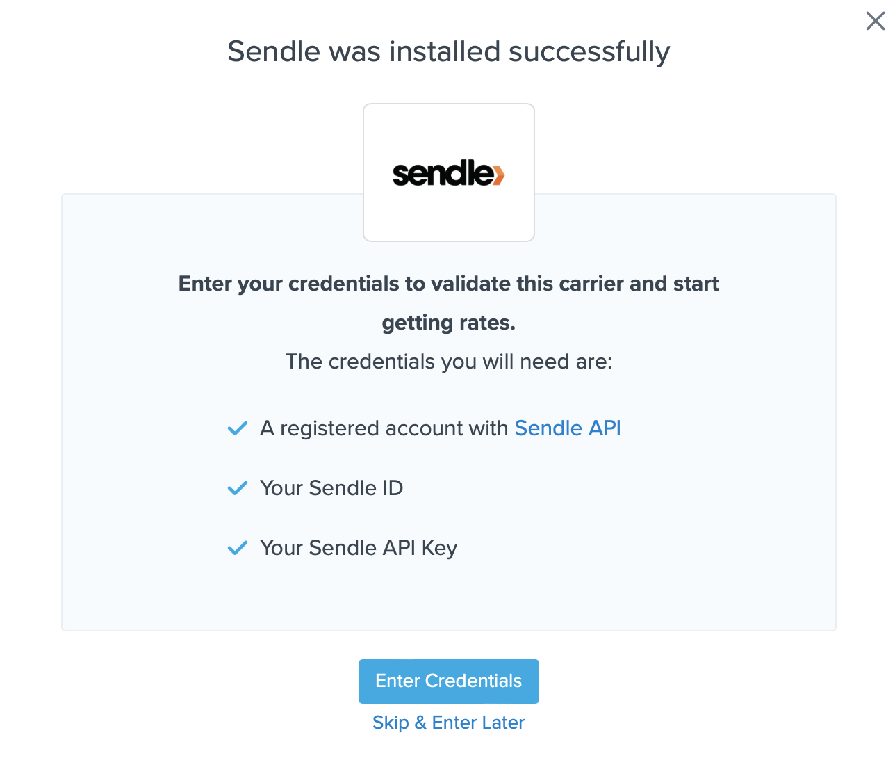 Note, you can select the Skip & Enter Later option, but the Sendle live rates won’t be enabled until these credentials are entered. You're reminded to add your credentials if you skip the validation process. This validation is necessary for ShipperHQ to access your shipping account and rates.