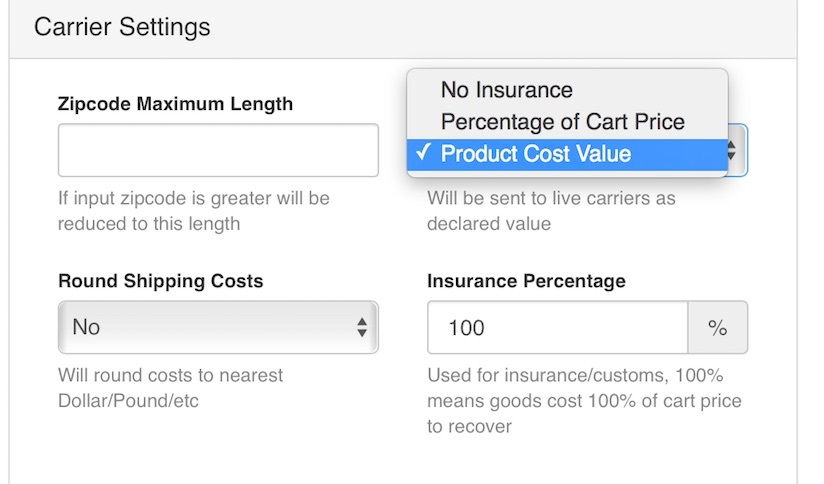 - Percentage of Cart Price: The total cart value is calculated using item prices and quantities. The final declared value is a percentage of this total, based on your Insurance Percentage value. To use this option, make sure you’ve entered a percentage in the Insurance Percentage field.