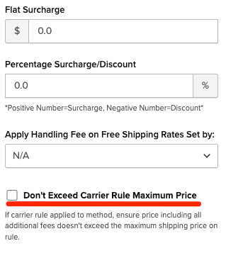 By default, handling fees apply across all scenarios unless adjusted. To prevent fees when a Maximum Fee is set on a Shipping Rule, enable Don't Exceed Carrier Rule Maximum Price. This option is in the selected Carrier Settings under the Fees Tab.