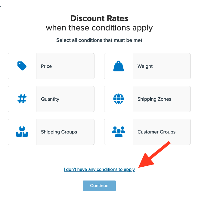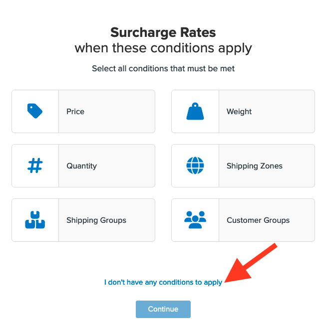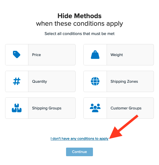 - After selecting the shipping method, click I Don't Have Any Conditions to Apply. We'll edit the rule with delivery day details once it's saved.