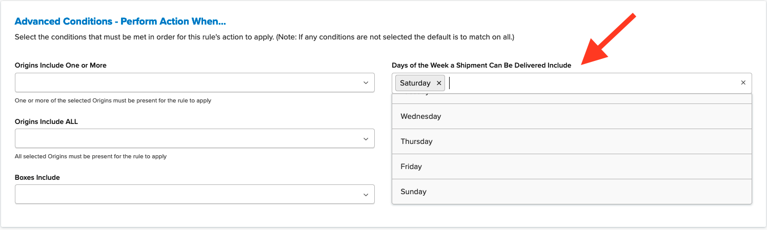 - Locate Days of the Week a Shipment Can Be Delivered and enter the day(s) where rates should be hidden. In this example, select Saturday.