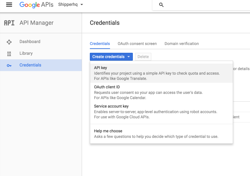 - Click "Credentials" in the left-hand menu and select "Create Credentials -> API Key."
