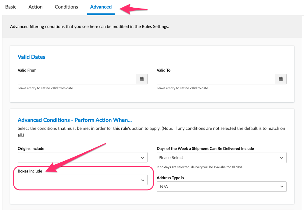 - Once selected, you'll find a "Boxes Include" option in the Advanced Conditions section of the Advanced tab in your Shipping Rules.