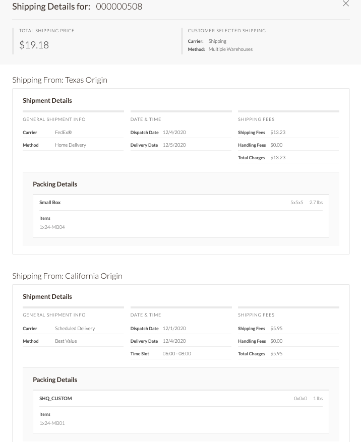 Orders with multiple products that require separate shipments allow customers to choose delivery options for each. This feature provides cost transparency, visibility into delivery dates, pickup times, and locations.