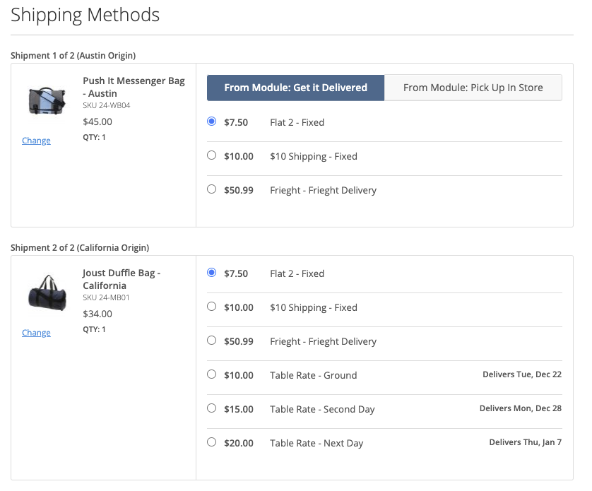 In Magento 2, you can enable Standard Checkout with Multi-origin functionality, but it shows a default view with merged rates. Merging prices and not displaying multiple delivery dates reduces transparency for customers, possibly contributing to cart abandonment.