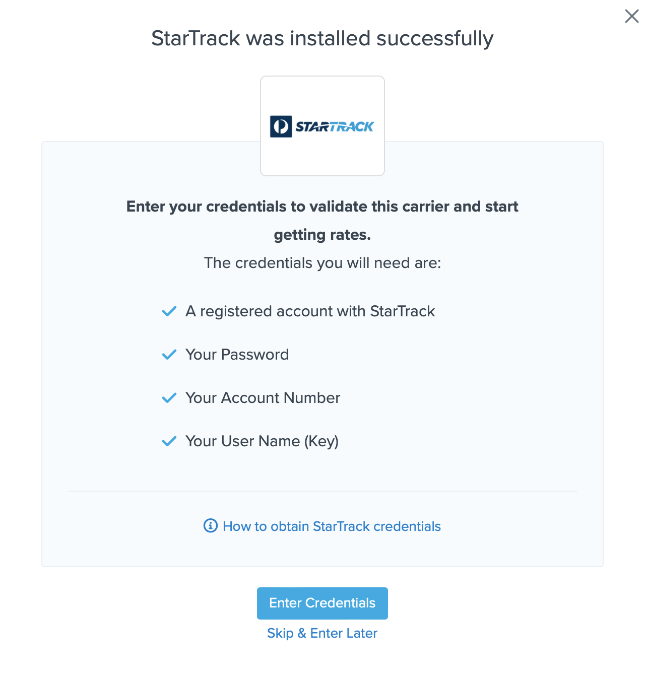 Note, you can select the Skip & Enter Later option, but the StarTrack live rates are not enabled until these credentials are entered. You are also reminded to add your credentials if you choose to skip the validation process. This validation is necessary for ShipperHQ to access your shipping account and rates.