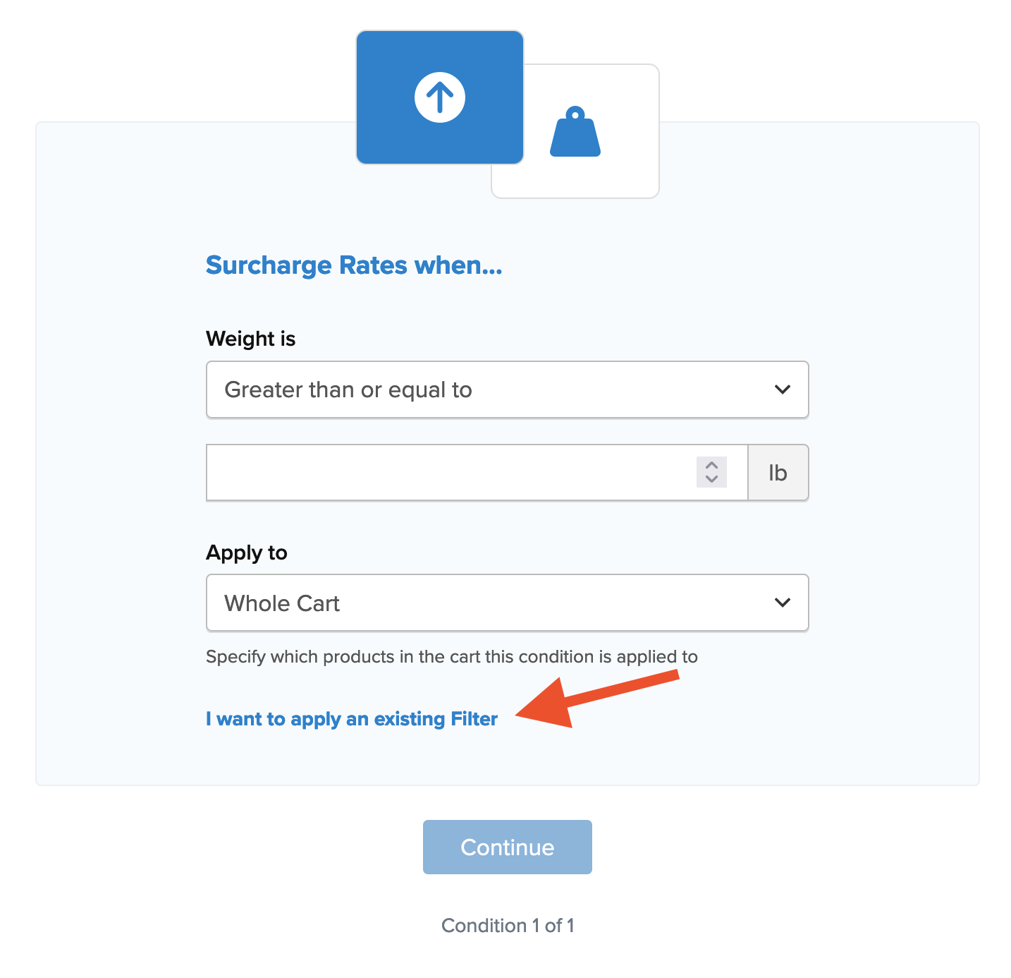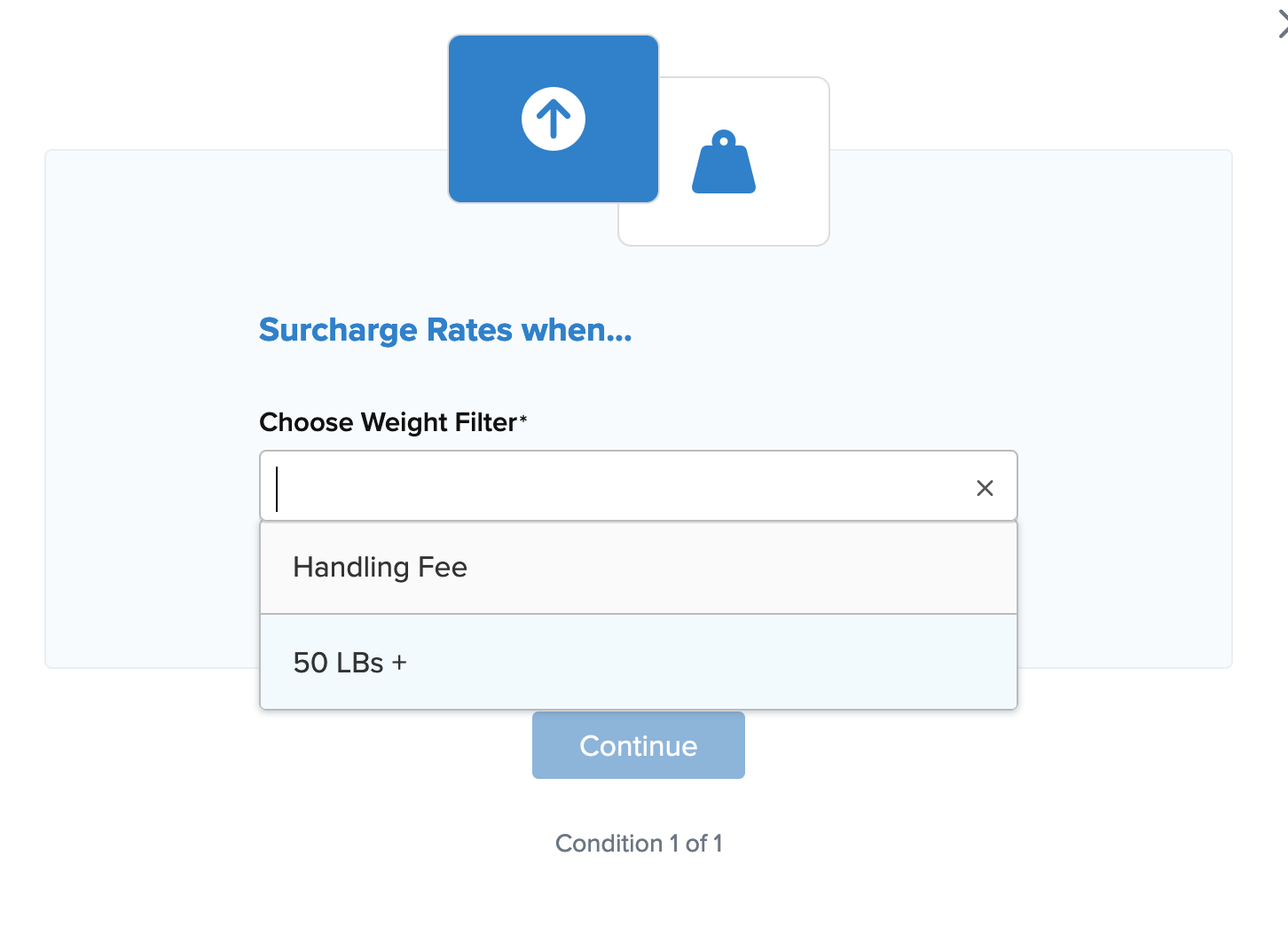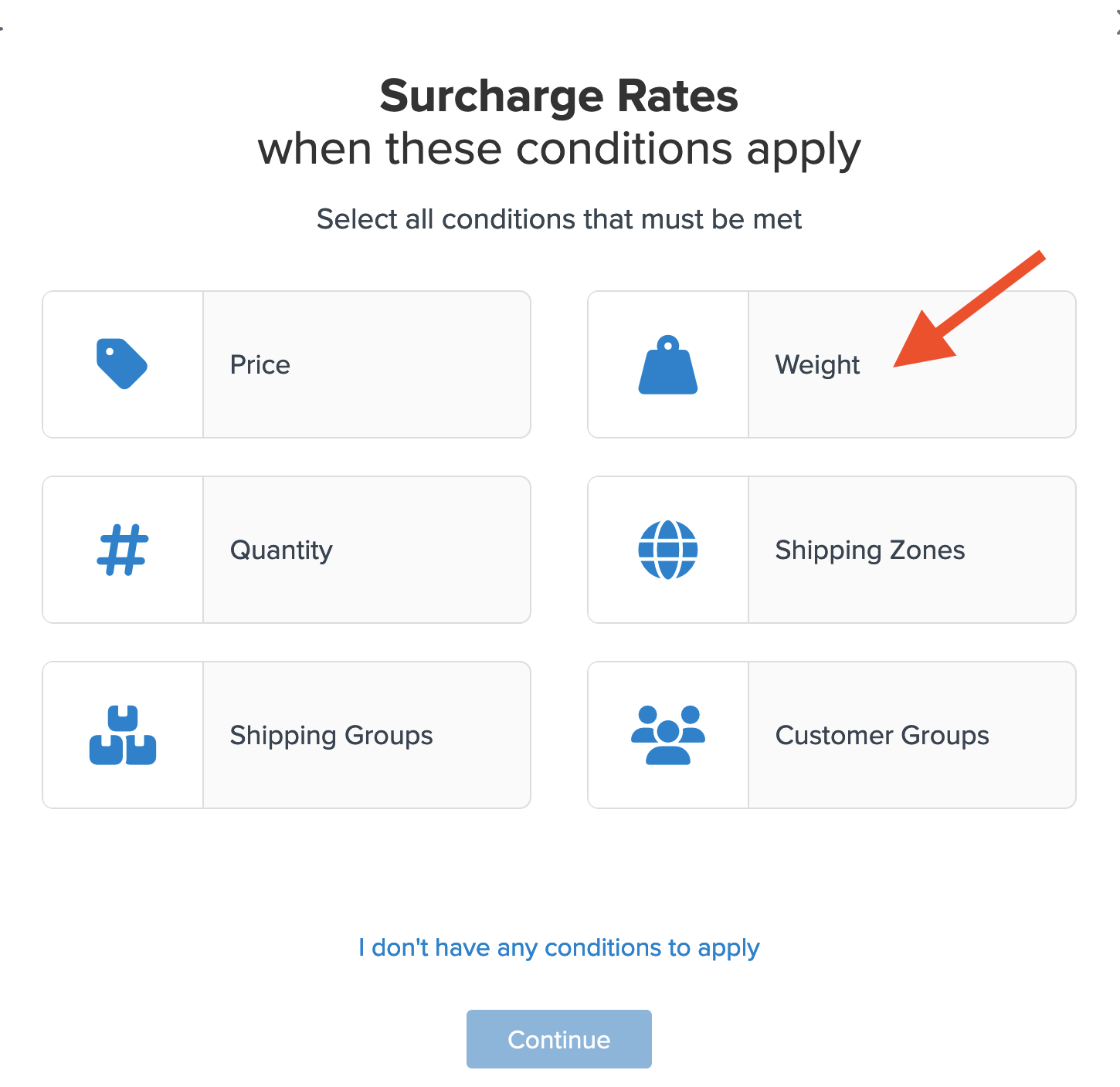 - Select the option to use Weight for the rule condition to apply this surcharge to the selected methods, then click Continue to proceed.