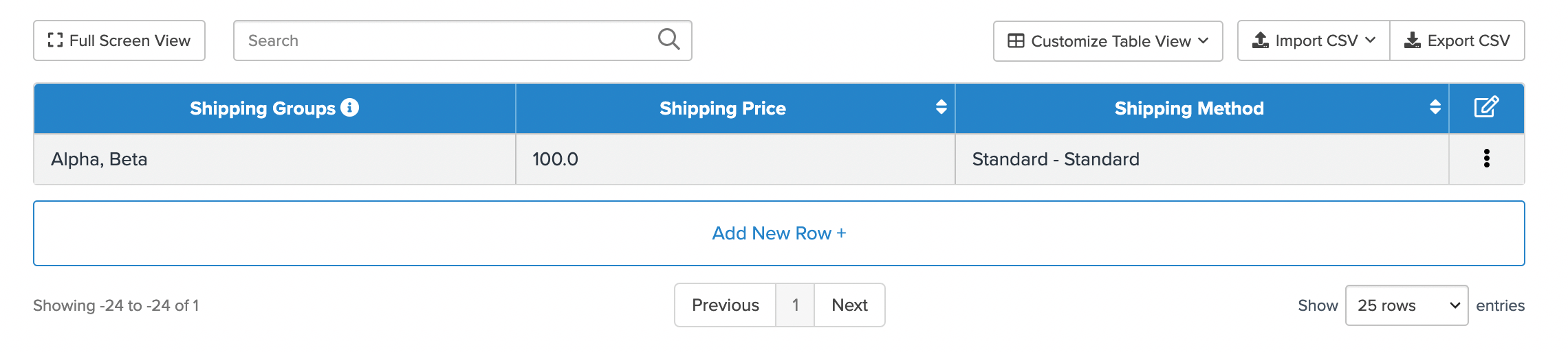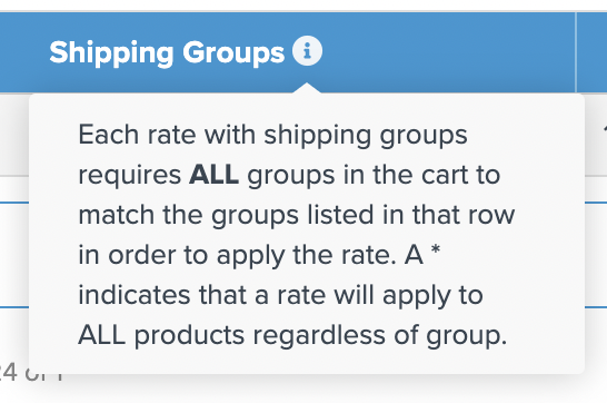 - Version 2.0: Requires all shipping groups in the row to be present for a match. For example, the rule only matches if both "Alpha" and "Beta" groups are in the cart.