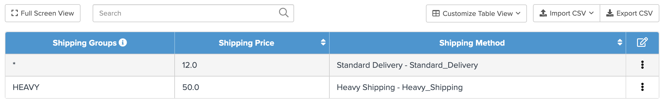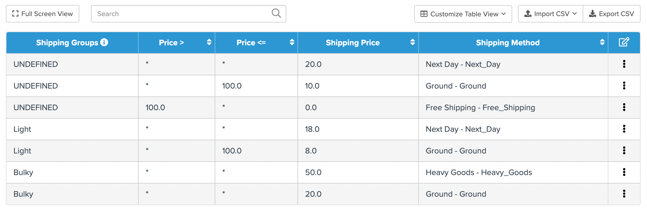 Below, rates for different shipping groups show the same shipping method names but with different rates. This is the simplest configuration for table rates carriers.