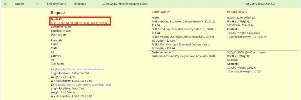 - The Transaction/Quote ID appears in the ShipperHQ-related logs, prefixed by "SHQ". Look for something like 'SHQ201608250254XXX_07488531'.