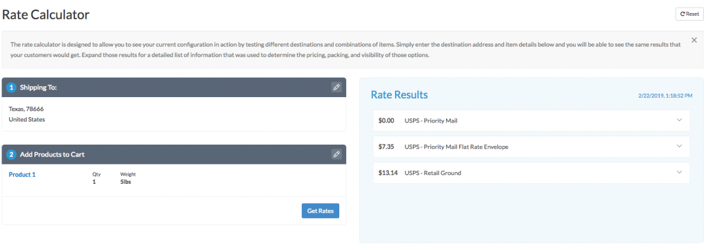 Within the ShipperHQ dashboard, the Rate Calculator section lets you test different destinations and combinations of items. Enter the destination address and item details to see the results your customers would get, similar to a cart estimator.