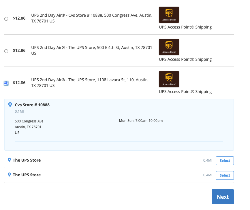 For Shopify and BigCommerce users, we offer specific features for UPS Access Point®. This solution is available for Magento 2, BigCommerce, Shopify, and WooCommerce versions of ShipperHQ. Customers can choose a pickup location at checkout. All available pickup locations are displayed as separate shipping methods.