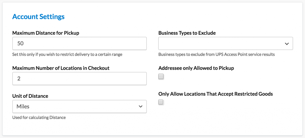 UPS Access Point® allows merchants to filter delivery locations based on acceptance of restricted goods or business type. Options are available in the Account Settings under the Basic panel of your UPS Access Point® carrier.