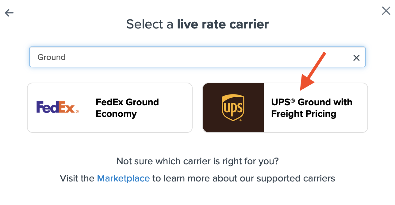 - Select See All Live Rate Carriers and search for "UPS Ground". If you do not have the Freight carriers feature enabled, you'll be prompted to enable it in this popup.