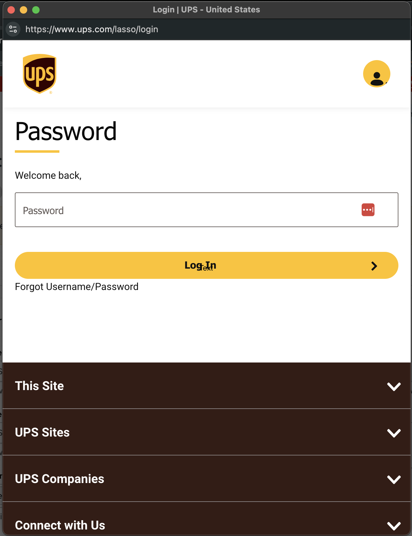 - When the UPS login screen appears, enter your username or the email address associated with your UPS account and accept the terms of use.
