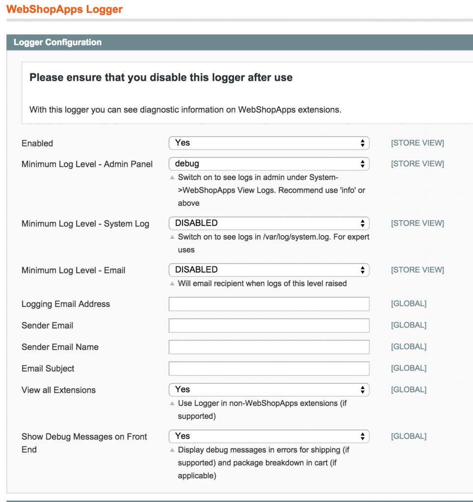 - Debug: Offers in-depth technical details. Primarily for experts or when guided by WebShopApps support.