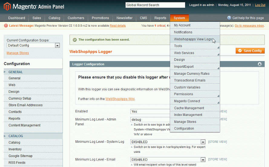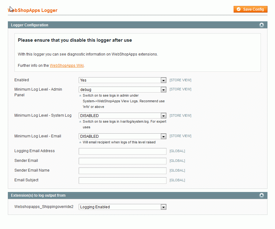 The Logger is configured under System->Webshopapps Logger. If you encounter an Access Denied error, log out and back into Magento admin. By default, logging is disabled.